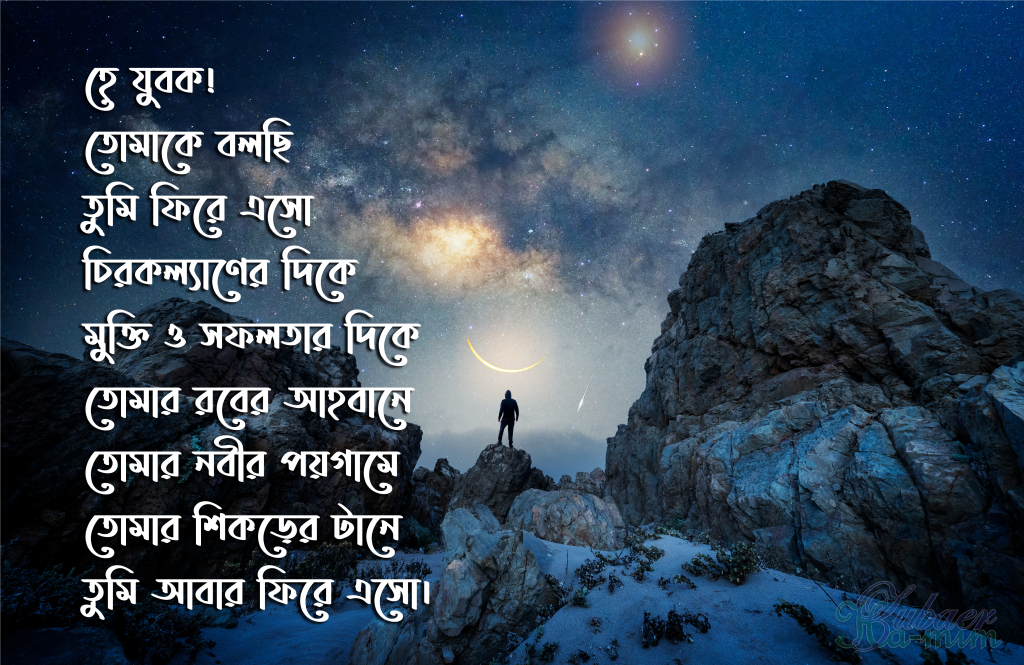 হে যুবক,এক বুক ভালবাসা নিয়েহৃদয়ভরা আবেগ নিয়েঅশ্রু ভেজা দুটি আঁখি নিয়েকান্নাজড়িত কন্ঠে তোমাকে বলছিতুমি শোনো।তোমার ভাই হিসেবে বলছিতোমার বন্ধু হিসেবে বলছিতোমার হিতাকাঙ্ক্ষী হিসেবে বলছিতোমার আমার এক কালিমাসে কালিমার পরিচয় নিয়ে বলছিআমার কথা তুমি শোনো। হে যুবক তোমাকে বলছিতুমি কি তোমার পরিচয় জানো ?তুমি আমি আমরা সবাইকোথা থেকে এসেছিআবার কোথায় যাবকে আমাদেরকে এইপৃথিবীতে পাঠিয়েছেন??কেনই বা পাঠিয়েছেন […]